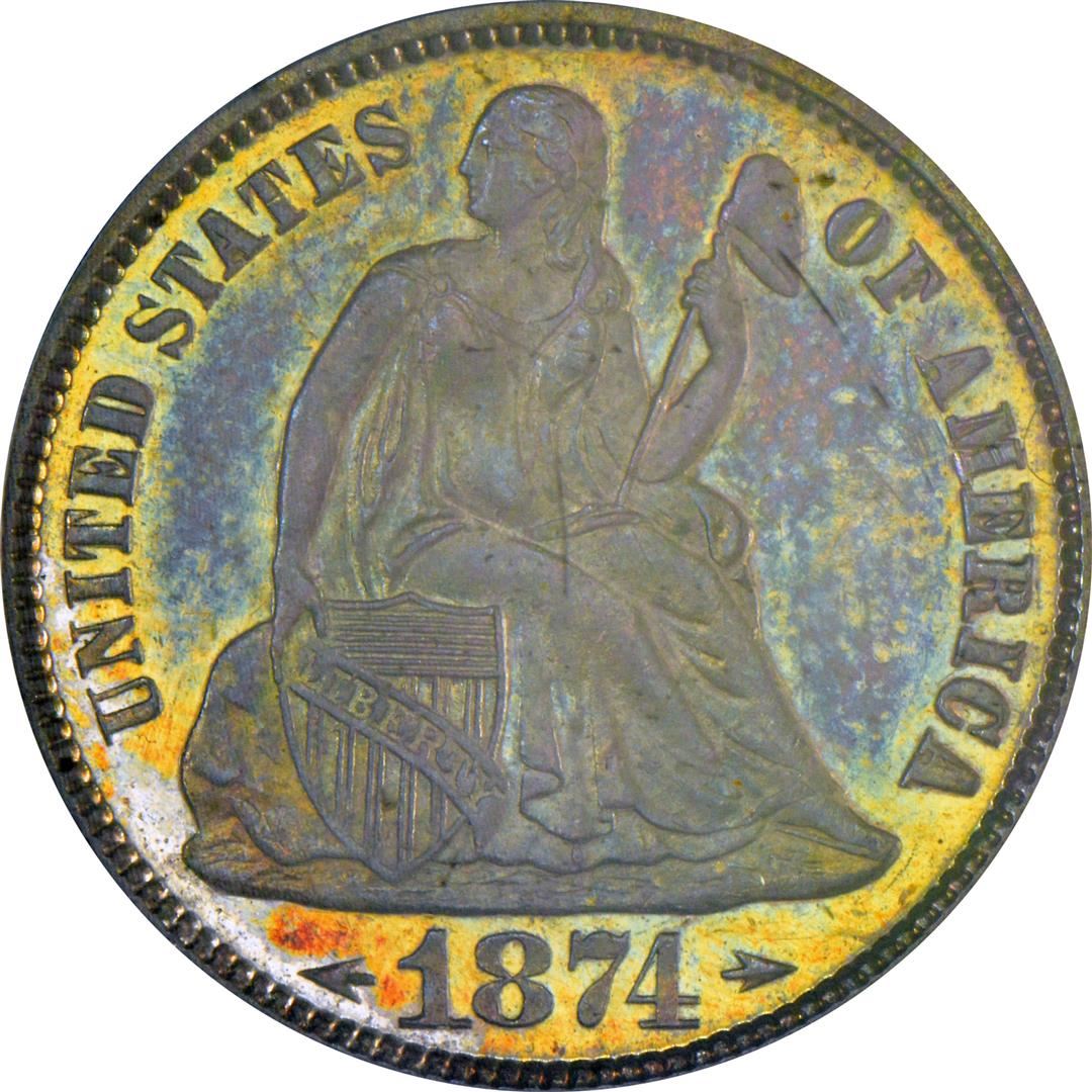 One 1874 Proof Seated Liberty Dime Coin Arrows PCGS PR65. PCGS Graded.