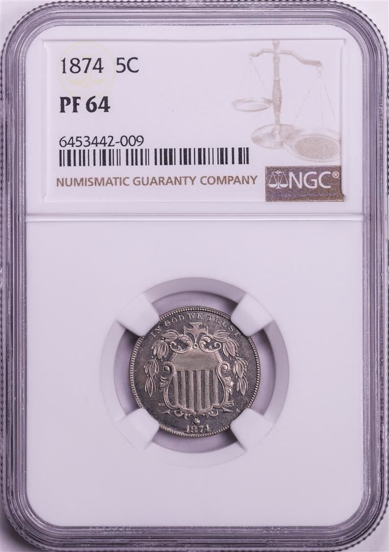 One 1874 Proof Shield Nickel Coin NGC PF64. NGC Certified.