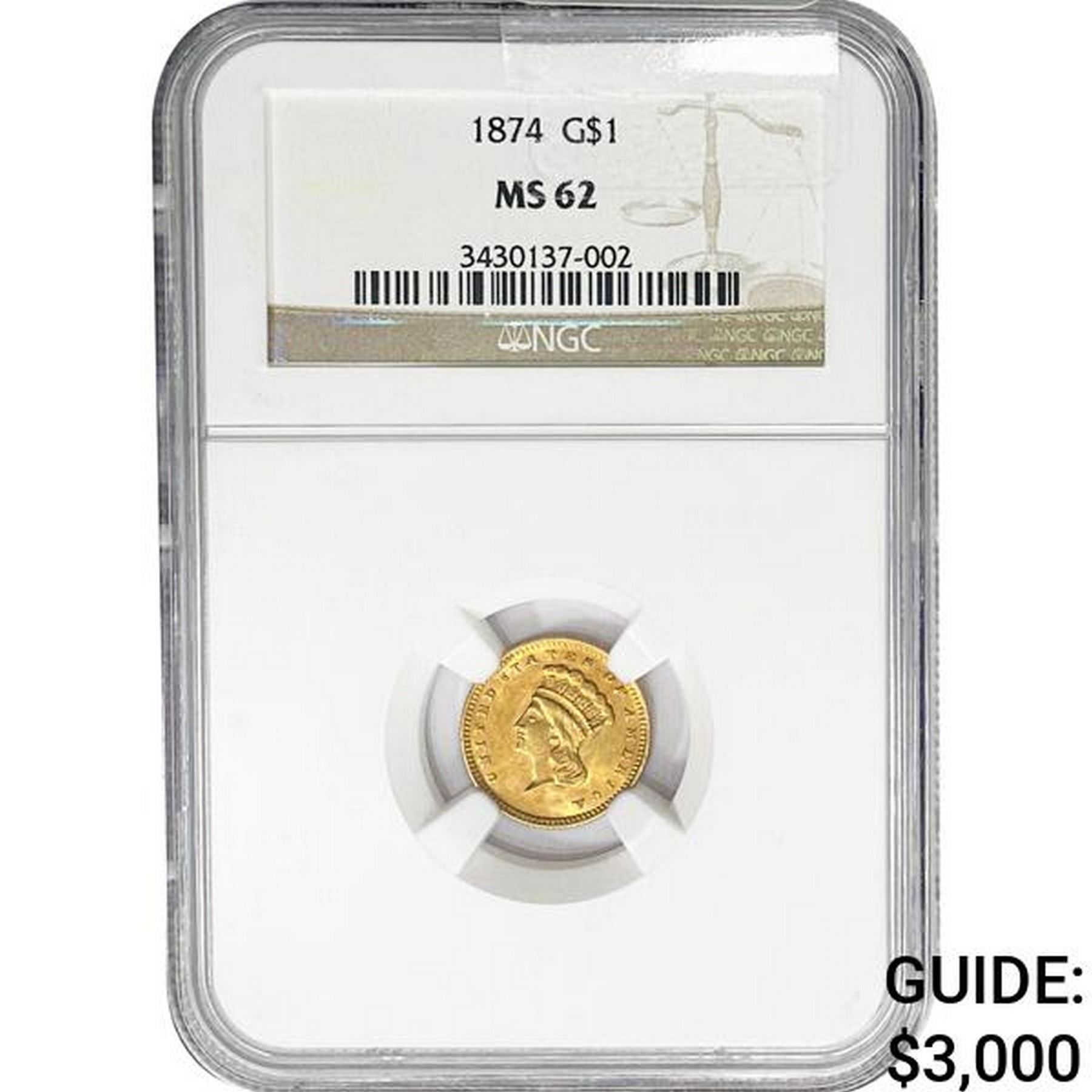 1874 Rare Gold Dollar NGC MS62