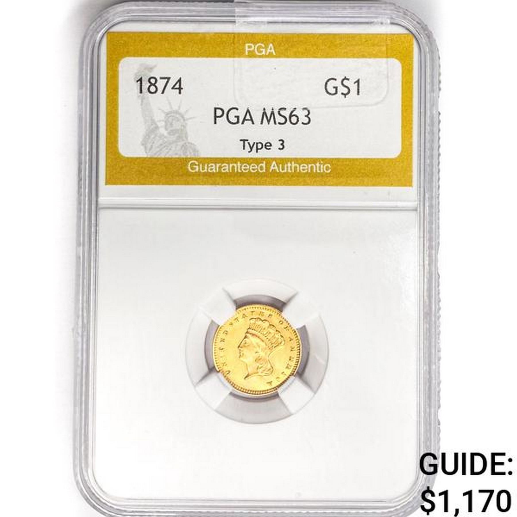 1874 Rare Gold Dollar PGA MS63 Type 3