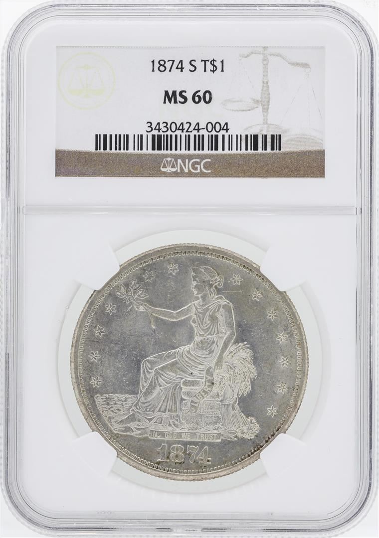One 1874-S $1 Trade Silver Dollar Coin NGC MS60. NGC Certified.