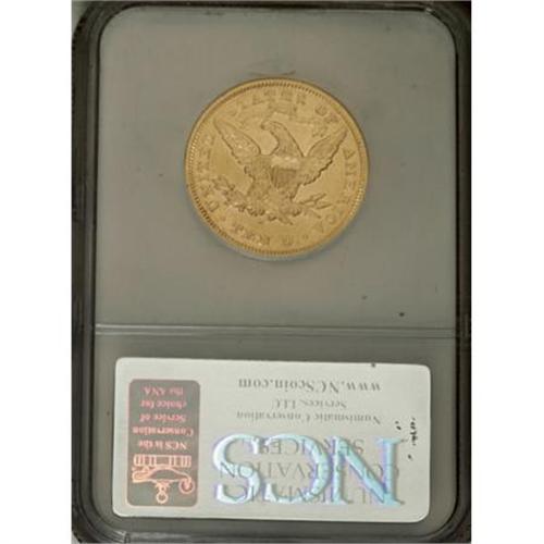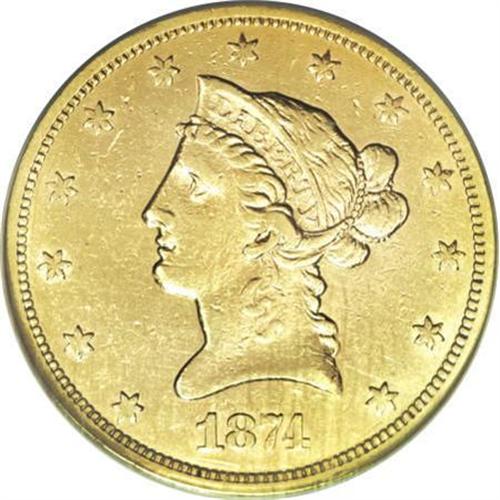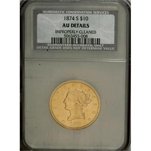 <B>1874-S $10 --Improperly Cleaned--NCS. AU Details.</B></I> Lightly hairlined yellow-gold surfaces are moderately abraded as usual for larger gold coins of this era. Despite being cleaned, this is an attractive example from a low mintage of just 10,000 coins. Few have survived in higher grades.<BR><BR><B>Coin Engraver:</B> Christian Gobrecht<BR><BR><b>Shipping:</b> Coins & Currency (<a target="_blank" href="http://www.heritageauctions.com/common/shipping.php">view shipping information</a>)