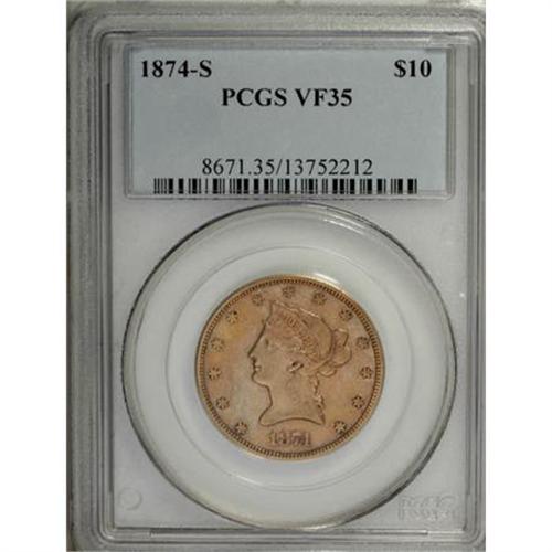 <B>1874-S $10 VF35 PCGS.</B></I> Deep orange-gold surfaces show subtle violet overtones in the fields. Subtle whispers of original luster appear near the stars of this faintly abraded Choice VF coin, one of just 10,000 pieces struck. Population: 7 in 35, 42 finer (1/08).<BR><BR><B>Coin Engraver:</B> Christian Gobrecht<BR><BR><b>Shipping:</b> Coins & Currency (<a target="_blank" href="http://www.heritageauctions.com/common/shipping.php">view shipping information</a>)