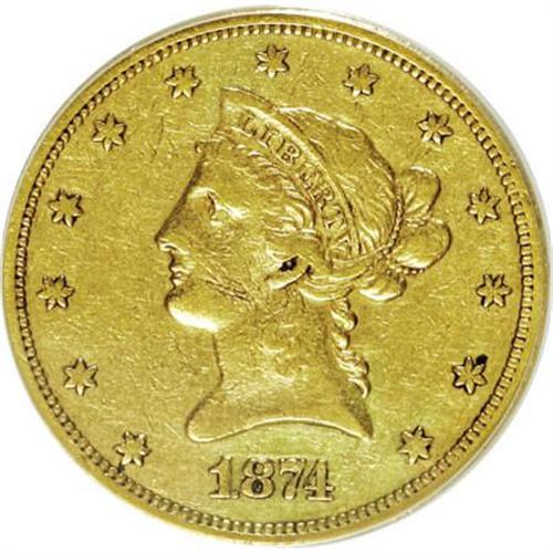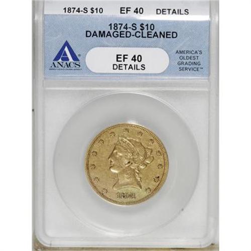 <B>1874-S $10 --Cleaned, Damaged--ANACS XF40 Details.</B></I> NGC Census: (10/46). PCGS Population (10/32). Mintage: 10,000. Numismedia Wsl. Price for NGC/PCGS coin in XF40: $2,625. (#8671)<BR><BR><B>Coin Engraver:</B> Christian Gobrecht<BR><BR><b>Shipping:</b> Coins & Currency (<a target="_blank" href="http://www.heritageauctions.com/common/shipping.php">view shipping information</a>)