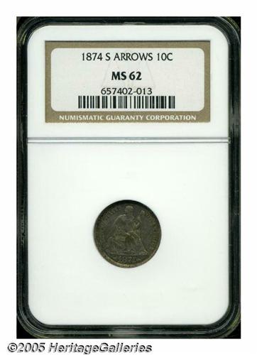 <B>1874-S<10C> Arrows MS62 NGC.</B></I> A deep layer of original toning blankets both sides of this sharply struck example. The underlying luster remains somewhat vibrant, and there are no distracting marks on either side of the coin.
