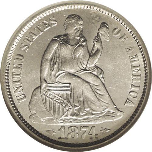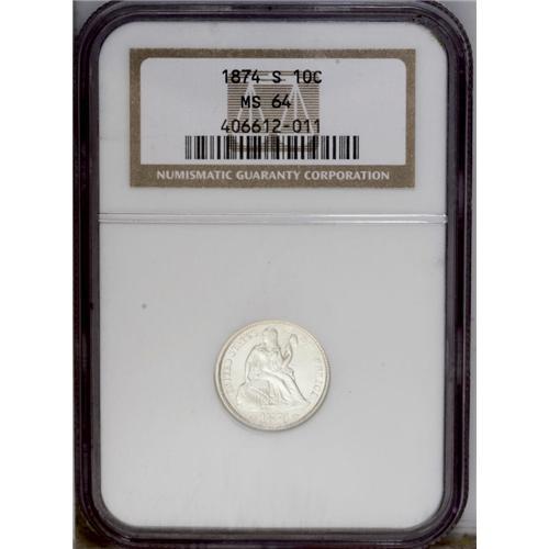 <B>1874-S<10C> Arrows MS64 NGC.</B></I> This With Arrows S-Mint dime displays lustrous silver-gray surfaces that are visited by whispers of light tan around the peripheries. The design elements are adequately brought up, except for weakness on Liberty's head and foot, and in the upper left part of the reverse wreath. A few minute handling marks scattered about define the grade. Census: 8 in 64, 3 finer (3/06).