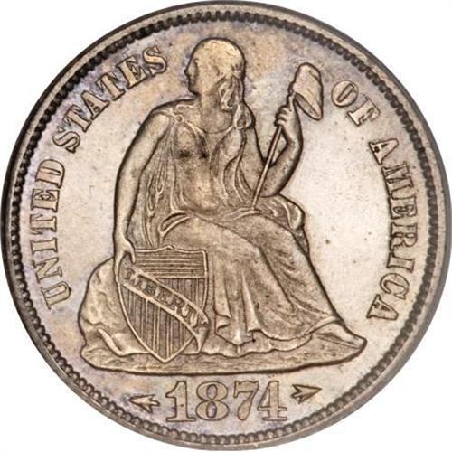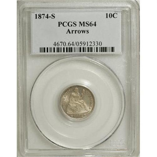 <B>1874-S 10C Arrows MS64 PCGS.</B></I> Greer-102, Fortin-102, Small Thin S. The 1874-S With Arrows dime, from a mintage of 240,000 pieces, is scarce in all grades, and Greer gives this variety a High R.6 rarity rating in Mint State. Light golden-gray patination accents hints of violet and blue on well preserved surfaces dancing with luster. The left arrowhead is repunched on this variety; the date slopes downward from left to right. The design elements are sharply struck, except for the usual softness on Liberty's head. Softly struck on the head, as usual, and with reverse die cracks, the one at 9 o'clock a rim cud, that at 1 o'clock moderate. Population: 12 in 64, 5 finer (3/08).<BR><BR><B>Coin Engraver:</B> Christian Gobrecht<BR><BR><b>Shipping:</b> Coins & Currency (<a target="_blank" href="http://www.heritageauctions.com/common/shipping.php">view shipping information</a>)