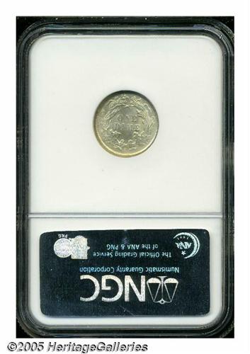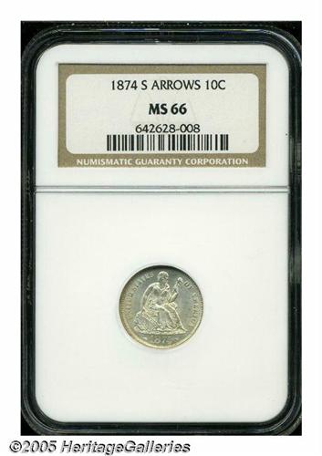 <B>1874-S<10C> Arrows MS66 NGC.</B></I> Throughout the various series of United States coins, certain issues have become known as condition rarities. This term refers to a relatively common coin that is rare or even extremely rare when above a certain grade level. Such is the case with this 1874-S Seated Liberty Dime. We have records of 12 examples that we have sold over the past dozen years, with the best previous coin grading just MS64. Likewise, NGC has graded 27 examples of this issue, with this and one other coin being the only Gem quality examples. As a date, 1874-S is a scarce issue from a mintage of 240,000 coins. In Gem quality, this issue is extremely rare, and the present coin is the best that has been certified, the only MS66 example of the date. The surfaces have frosty luster with pale champagne toning. A few tiny planchet flakes are as struck, with only the slightest of post-mint blemishes. The reverse has several light die cracks through the wreath. Population: 1 in 66, 0 finer (5/05).