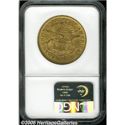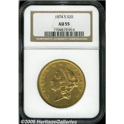 <B>1874-S $20 AU55 NGC.</B></I> Well struck and lustrous, with rich coloration and a mildly scuffy appearance overall. Lightly worn on the highpoints.