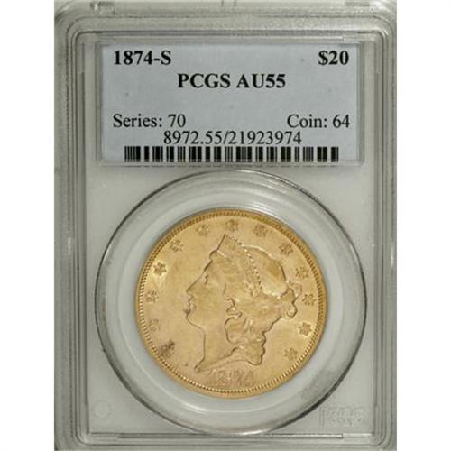 <B>1874-S $20 AU55 PCGS.</B></I> PCGS Population (191/464). NGC Census: (388/1479). Mintage: 1,214,000. Numismedia Wsl. Price for NGC/PCGS coin in AU55: $725. (#8972)<BR><BR><B>Coin Engraver:</B> James B. Longacre<BR><BR><b>Shipping:</b> Coins & Currency (<a target="_blank" href="http://www.heritageauctions.com/common/shipping.php">view shipping information</a>\)
