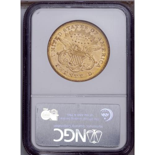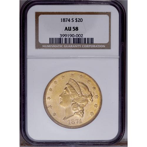 <B>1874-S<$20> AU58 NGC.</B></I> Ample luster is visible in the recessed areas of this bright, peach-gold S-mint twenty. Generally well executed, save for minor softness in portions of Liberty's hair and in the stars along the left (facing) border. A few minute bagmarks are noted over each side.