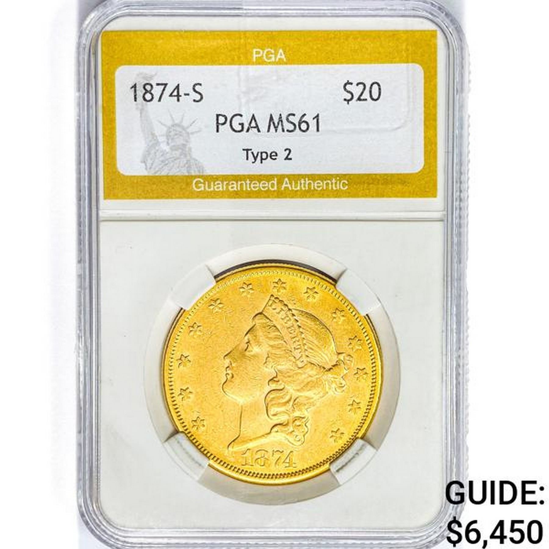 1874-S $20 Gold Double Eagle PGA MS61 Type 2