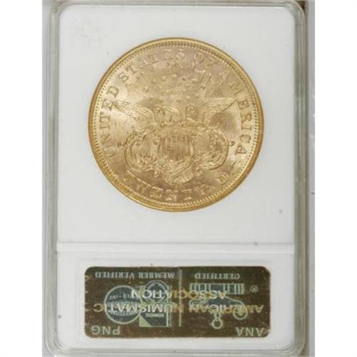 <B>1874-S $20 MS60 ANACS.</B></I> A fully Mint State survivor with warm rose-gold color, nice luster, and many little surface marks (as one must expect in an MS60). While available in lower grades, this issue is scarce in Mint State. <BR><BR><B>Coin Engraver:</B> James B. Longacre<BR><BR><b>Shipping:</b> Coins & Currency (<a target="_blank" href="http://www.heritageauctions.com/common/shipping.php">view shipping information</a>)