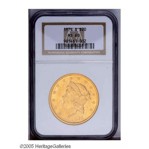 <B>1874-S<$20> MS60 NGC.</B></I> A lovely example with lustrous light yellow color and slightly deeper toning on the reverse. The surfaces are pleasing and the design elements are sharply defined.<BR><I>From The Frank Manthey Collection of Gold Coins.</B></I>