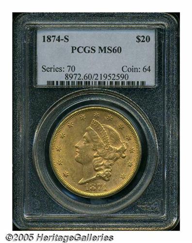 <B>1874-S<$20> MS60 PCGS.</B></I> Fully lustrous with rich red-golden color. A moderately abraded example of this conditionally scarcer San Francisco issue.