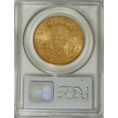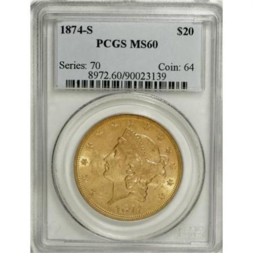 <B>1874-S $20 MS60 PCGS.</B></I> Sharply struck, with pretty peach-gold color and nice luster. A few light contact marks and luster grazes help to define the grade; nevertheless, this MS60 specimen exudes considerable visual appeal for the grade.<BR><BR><B>Coin Engraver:</B> James B. Longacre<BR><BR><b>Shipping:</b> Coins & Currency (<a target="_blank" href="http://www.heritageauctions.com/common/shipping.php">view shipping information</a>)