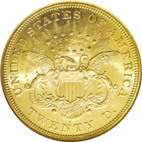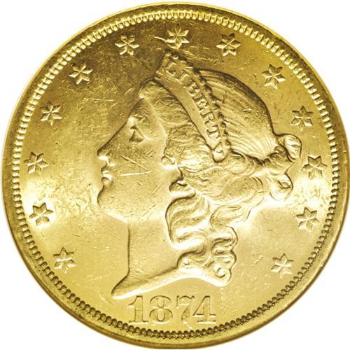 <B>1874-S<$20> MS61 ANACS.</B></I> A lustrous honey-gold example with no trace of wear. Like many of this issue, this piece has weakness on the bun of hair and the eagle's tailfeathers. Numerous marks, including two notable marks on Liberty's cheek and a small scrape near the truncation of the bust, account for the grade.
