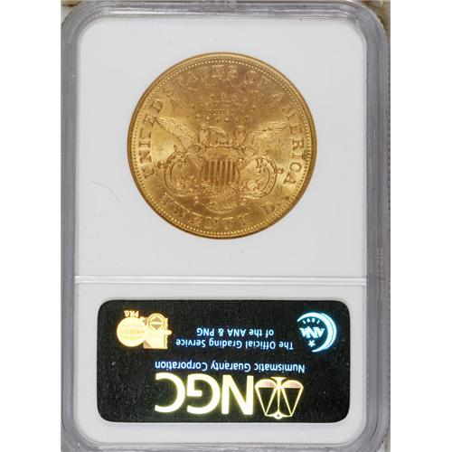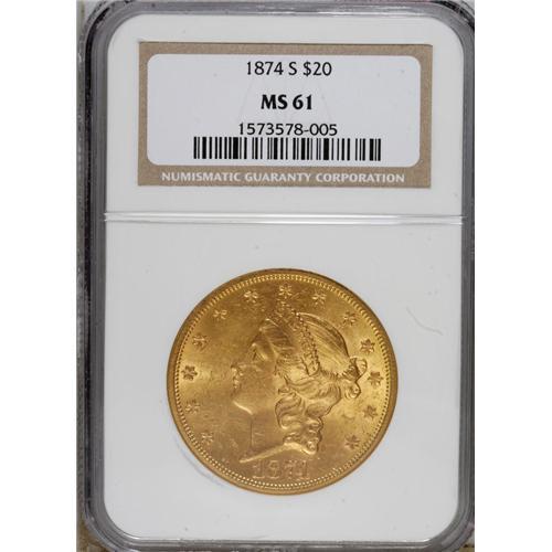 <B>1874-S $20 MS61 NGC.</B></I> A frosty Mint State representative, this piece is finer than most examples of the date. The surfaces are fully brilliant with attractive light yellow surfaces.<BR><BR><b>Shipping:</b> Coins & Currency (<a target="_blank" href="http://www.heritageauctions.com/common/shipping.php">view shipping information</a>)