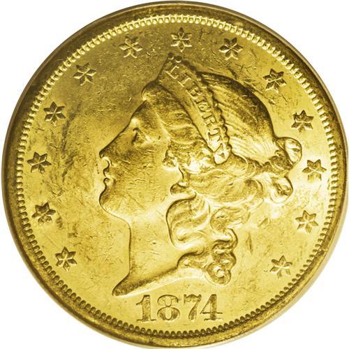 <B>1874-S $20 MS61 PCGS.</B></I> A frosty Mint State example with lightly abraded surfaces as expected for the grade. This is an attractive and fully lustrous piece with bright yellow-gold color and pale pinkish highlights. Although the population of MS60 and MS61 grade coins is substantial, few finer quality pieces have been certified, including just 35 by PCGS (10/06).<BR><BR><b>Shipping:</b> Coin/Currency (<a target="_blank" href="http://www.heritageauctions.com/common/shipping.php">view shipping information</a>)