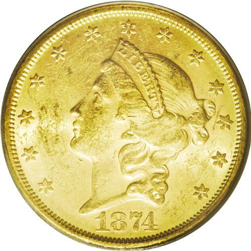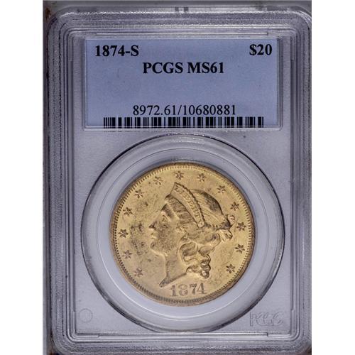 1874-S $20 MS61 PCGS. A frosty, very attractive specim 1874-S