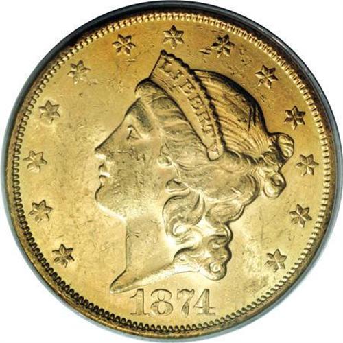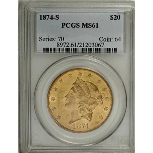 <B>1874-S $20 MS61 PCGS.</B></I> A frosty, very attractive specimen that, if not for a few scattered abrasions, could easily qualify at a higher grade level. Apricot-gold surfaces display well defined motifs. Of the 700 or so pieces that have been certified by PCGS or NGC as Uncirculated, the vast majority are at the MS60 or MS61 level.<BR><BR><B>Coin Engraver:</B> James B. Longacre<BR><BR><b>Shipping:</b> Coins & Currency (<a target="_blank" href="http://www.heritageauctions.com/common/shipping.php">view shipping information</a>)