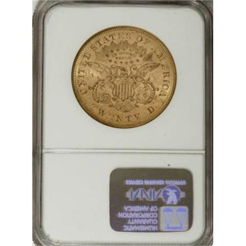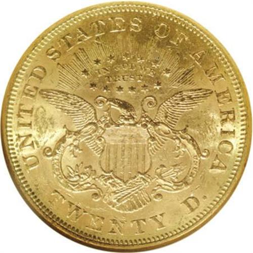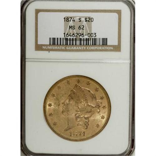 <B>1874-S $20 MS62 NGC.</B></I> Though it rates alongside the most available Type Two double eagle issues in circulated grades, the 1874-S becomes surprisingly challenging in Mint State, particularly MS62. The soft, pleasing luster of this well struck example enlivens yellow-gold surfaces that show alloy accents on the devices. NGC and PCGS have graded just six finer coins between them, three at each service (10/07).<BR><BR><B>Coin Engraver:</B> James B. Longacre<BR><BR><b>Shipping:</b> Coins & Currency (<a target="_blank" href="http://www.heritageauctions.com/common/shipping.php">view shipping information</a>)