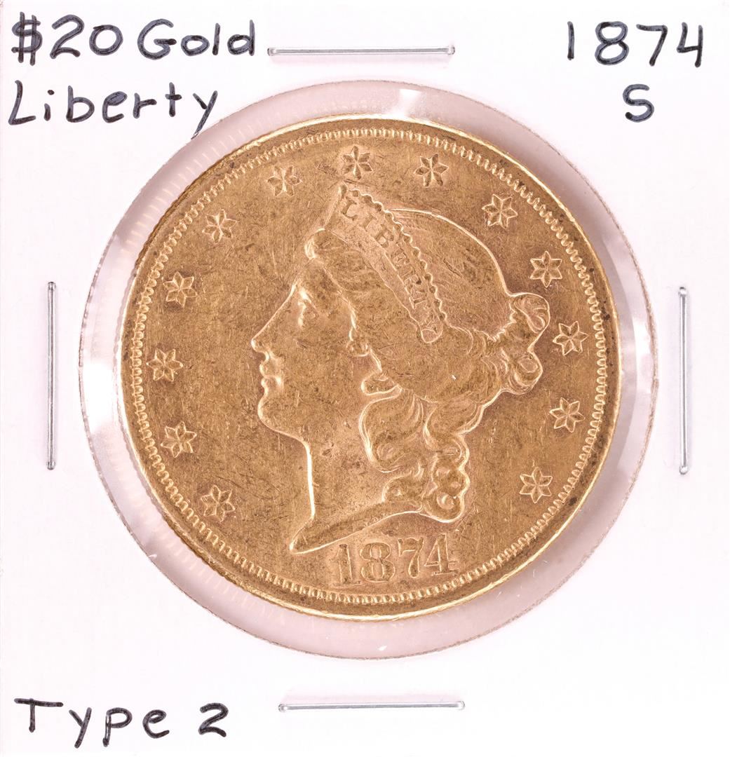 One 1874-S $20 Type 2 Liberty Head Double Eagle Gold Coin.