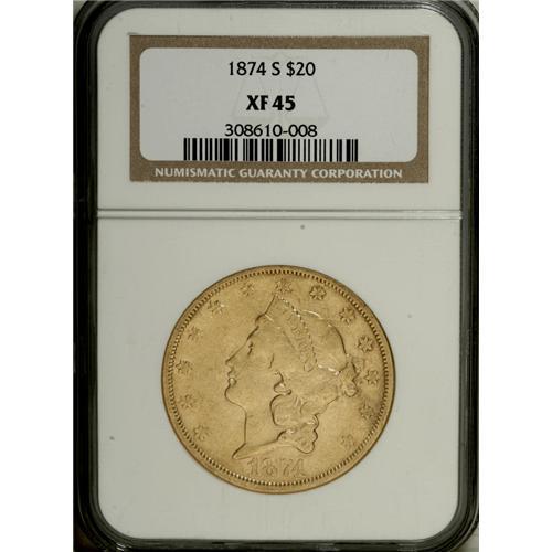1874-S $20 XF45 NGC. NGC Census: (73/2081). PCGS P