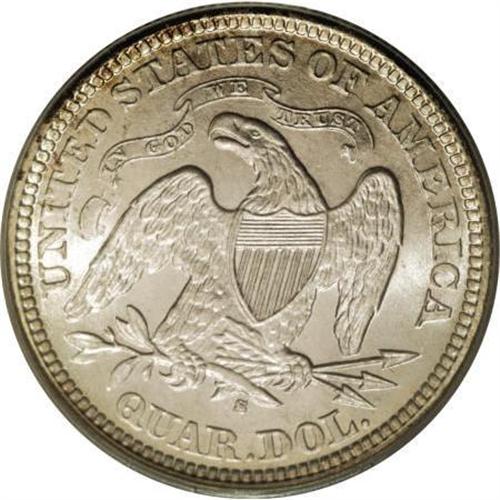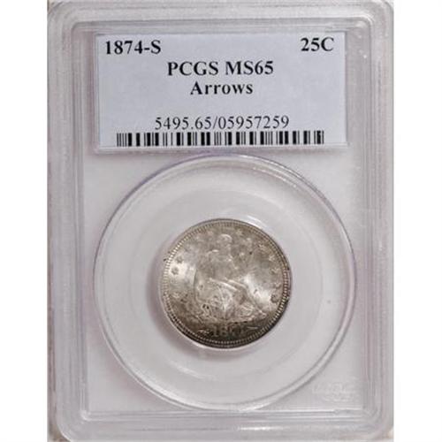 <B>1874-S 25C Arrows MS65 PCGS.</B></I> Apple-green toning dominates the lower obverse, but the remainder of this lustrous Gem is predominantly pearl-gray. Boldly struck except for the upper left stars, and free from consequential contact. A splendid example of this briefly produced type. Population: 49 in 65, 28 finer (6/07).<BR><BR><B>Coin Engraver:</B> Christian Gobrecht<BR><BR><b>Shipping:</b> Coins & Currency (<a target="_blank" href="http://www.heritageauctions.com/common/shipping.php">view shipping information</a>\)