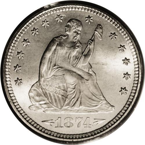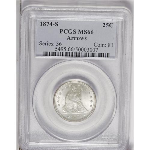 <B>1874-S<25C> Arrows MS66 PCGS.</B></I> This Premium Gem is an exceptional example with frosty mint luster and brilliant silver surfaces. Wispy gold toning is evident on the reverse. The second generation With Arrows coinage spanned 1873 and 1874, including examples struck in Philadelphia, Carson City, and San Francisco. Of the various varieties, the 1874-S is the most easily obtained in higher Mint State grades, despite a mintage lower than either Philadelphia Mint variety. Population: 25 in 66, 1 finer (7/06).