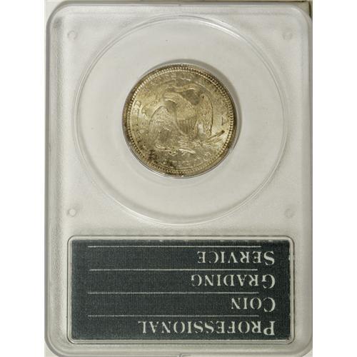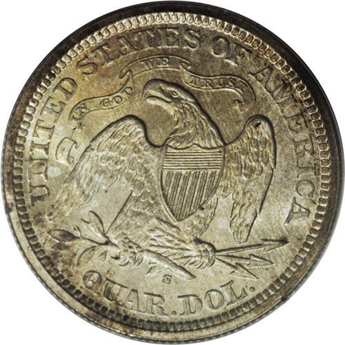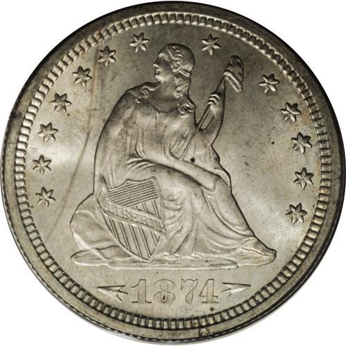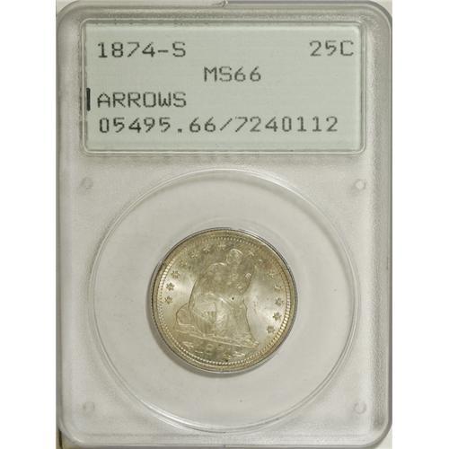 <B>1874-S 25C Arrows MS66 PCGS.</B></I> Vibrant luster adorns both sides of this S-mint quarter. A few wisps of light toning are seen on the obverse, while the reverse displays somewhat more extensive shadings of gold-tan and powder-blue. Exquisitely struck and well preserved. Housed in a first-generation PCGS holder. Population: 27 in 66, 1 finer (2/07).<BR><BR><b>Shipping:</b> Coins & Currency (<a target="_blank" href="http://www.heritageauctions.com/common/shipping.php">view shipping information</a>)