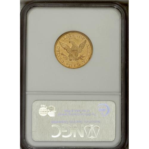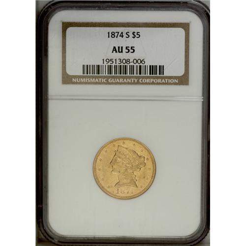 <B>1874-S $5 AU55 NGC.</B></I> Luminous honey-gold luster emerges throughout the borders, particularly on the reverse. Nicely brought up, with minor softness noted on the hair above the coronet. A challenging issue at the AU55 level, since only 16,000 pieces were struck, and all went into circulation. Neither service has certified any above the AU58 level. Census: 12 in 55, 7 finer (10/06).<BR><BR><b>Shipping:</b> Coin/Currency (<a target="_blank" href="http://www.heritageauctions.com/common/shipping.php">view shipping information</a>)