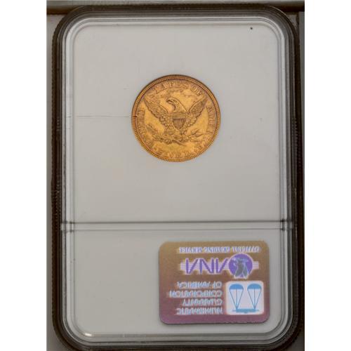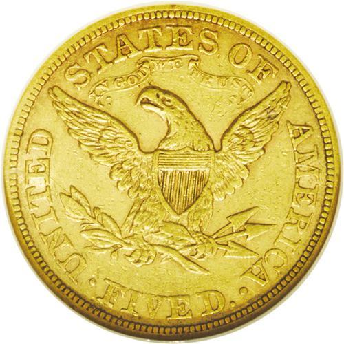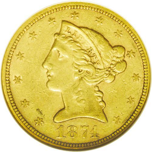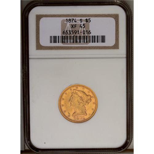 <B>1874-S<$5> XF45 NGC.</B></I> The '74-S half eagle is somewhat more challenging that its small mintage of only 16,000 pieces would imply, and presently no Mint State examples have been certified by either major service (5/06). This is a moderately abraded reddish-golden example with normally weak mintmark, two characteristics we have seen on most other '74-S half eagles we have seen. A number of small field abrasions do not appreciably detract. One dark spot is mentioned near star 1 in the obverse field.