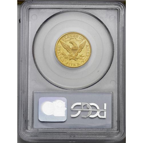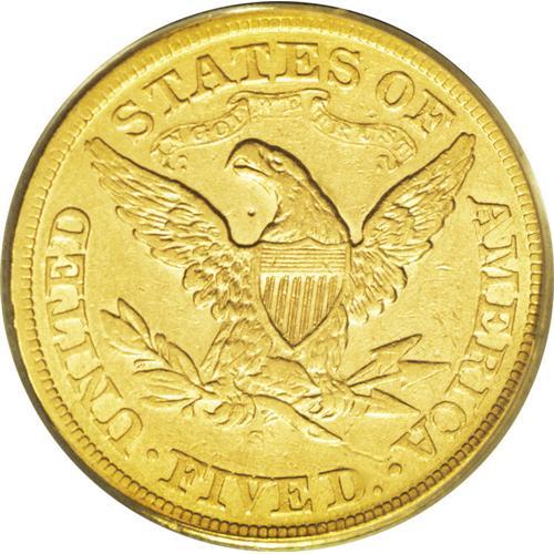 <B>1874-S<$5> XF45 PCGS.</B></I> Well detailed for the grade, with light wear on the wingtips and neck feathers of the eagle. Still mildly lustrous, and lightly marked overall, with a pleasing, smooth, nearly problem-free appearance. One tiny, circular indention is noted (for pedigree purposes) to the left of the eagle's neck. One of only 16,000 pieces coined, and a scarce high grade survivor. Population: 6 in 45, 13 finer (6/06).