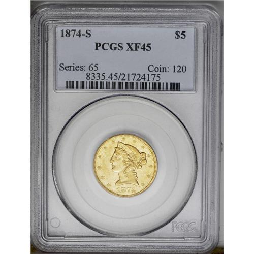 1874-S $5 XF45 PCGS. Well detailed for the grade, with