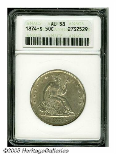 <B>1874-S<50C> Arrows AU58 ANACS.</B></I> Bright, silver-gray surfaces reveal good remaining luster. The design elements are sharply struck, and both sides appear to be free of mentionable abrasions. The 1874-S Half Dollar has a limited mintage of 394,000 pieces and is a much scarcer With Arrows issue in all grades.<BR><I>From The Empire State Collection, Part Two.</B></I>