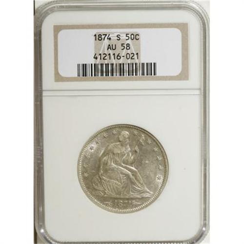 <B>1874-S 50C Arrows AU58 NGC.</B></I> Generous amounts of luster remain on the silver surfaces visited by traces of light olive-green. Quite clean throughout, and sharply struck on the design elements. A scarce date, especially in higher circulated grades. Rare in Mint State.<B><BR></B></I><I>From The Beau Clerc Collection.</B></I><BR><BR><B>Coin Engraver:</B> Christian Gobrecht<BR><BR><b>Shipping:</b> Coins & Currency (<a target="_blank" href="http://www.heritageauctions.com/common/shipping.php">view shipping information</a>)