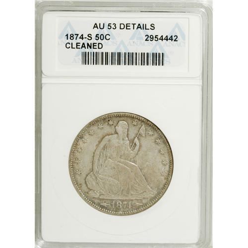 <B>1874-S 50C Arrows--Cleaned--ANACS. AU53 Details.</B></I> NGC Census: (1/29). PCGS Population (1/31). Mintage: 394,000. Numismedia Wsl. Price: $635. (#6348)<BR><BR><b>Shipping:</b> Coins & Currency (<a target="_blank" href="http://www.heritageauctions.com/common/shipping.php">view shipping information</a>)