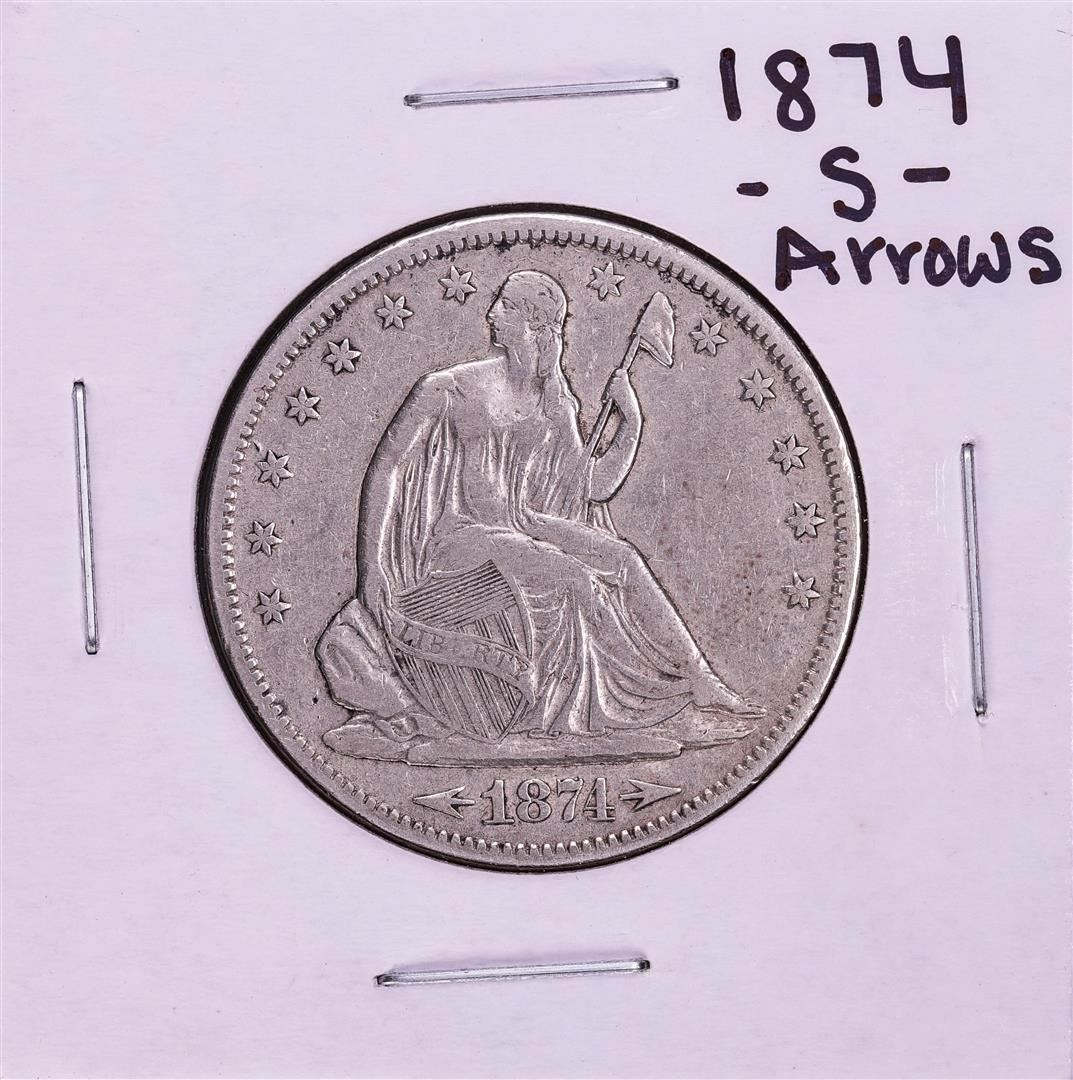 One 1874-S Arrows Seated Liberty Half Dollar Coin.