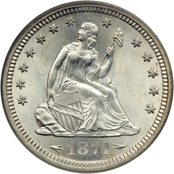 1874-S Liberty Seated Quarter Dollar. Arrows. PCGS graded MS-66. Housed in an Old Green Holder. A fully struck white coin. Pop 30; 1 finer in 67 (PCGS # 5495) .