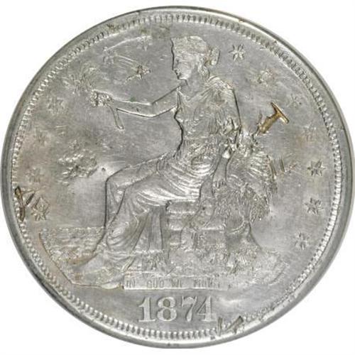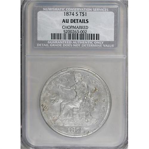 <B>1874-S T$1 Chopmarked NCS. AU Details. </B></I> NGC Census: (4/224). PCGS Population (14/270). Mintage: 2,549,000. Numismedia Wsl. Price for NGC/PCGS coin in AU50: $205. (#7036)<BR><BR><B>Coin Engraver:</B> William Barber<BR><BR><b>Shipping:</b> Coins & Currency (<a target="_blank" href="http://www.heritageauctions.com/common/shipping.php">view shipping information</a>)