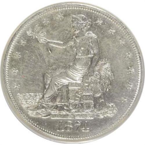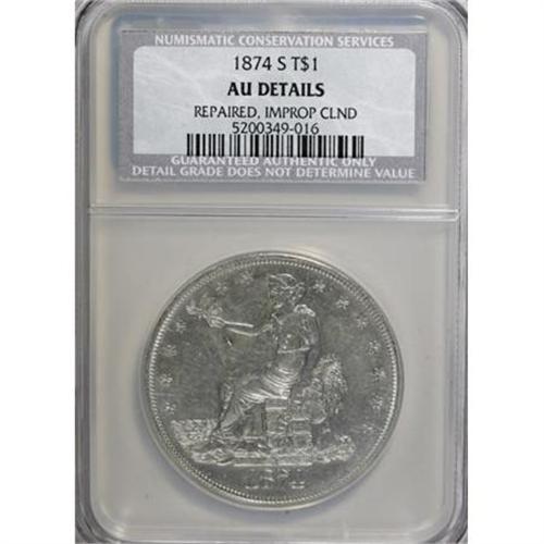 <B>1874-S T$1 --, Improperly Cleaned, Repaired--NCS. AU Details.</B></I> NGC Census: (4/228). PCGS Population (14/270). Mintage: 2,549,000. Numismedia Wsl. Price for NGC/PCGS coin in AU50: $250. (#7036)<BR><BR><B>Coin Engraver:</B> William Barber<BR><BR><b>Shipping:</b> Coins & Currency (<a target="_blank" href="http://www.heritageauctions.com/common/shipping.php">view shipping information</a>)
