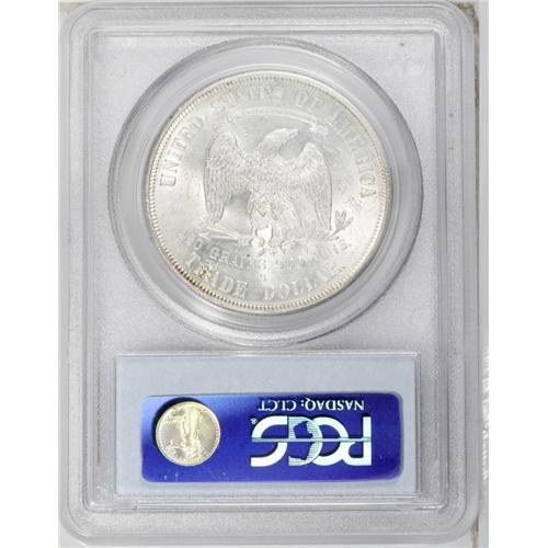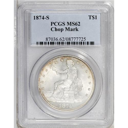 <B>1874-S T$1 Chop Mark MS62 PCGS.</B></I> Medium S. Breen-5784. Strongly lustrous beneath light haze and well struck. Golden-tan toning is noted at the obverse periphery. Two chops affect the reverse, one on the eagle's lower body, the other at the R in TRADE.<BR><BR><b>Shipping:</b> Coin/Currency (<a target="_blank" href="http://www.heritageauctions.com/common/shipping.php">view shipping information</a>)