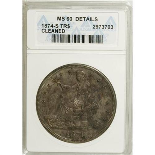 <B>1874-S T$1 --Cleaned--ANACS. MS60 Details.</B></I> NGC Census: (11/157). PCGS Population (18/175). Mintage: 2,549,000. Numismedia Wsl. Price for NGC/PCGS coin in MS60: $500. (#7036)<BR><BR><b>Shipping:</b> Coins & Currency (<a target="_blank" href="http://www.heritageauctions.com/common/shipping.php">view shipping information</a>)