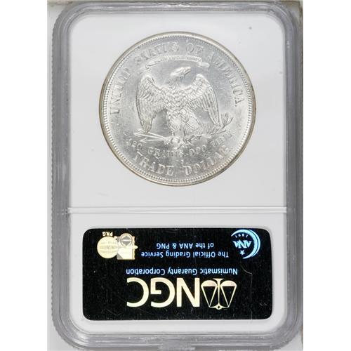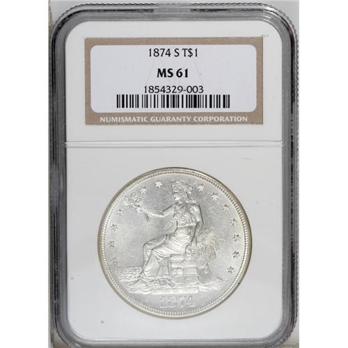 <B>1874-S T$1 MS61 NGC.</B></I> A brilliant and conditionally scarce Trade dollar with surprisingly few marks given the MS61 grade. Minor strike-throughs have little effect on the obvious eye appeal. Crisply struck aside from Liberty's hair and the right (facing) claw.<BR><BR><b>Shipping:</b> Coin/Currency (<a target="_blank" href="http://www.heritageauctions.com/common/shipping.php">view shipping information</a>)