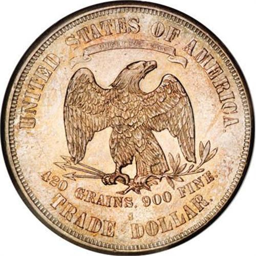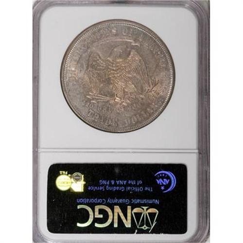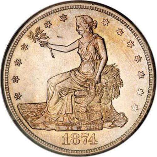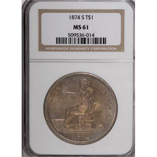 <B>1874-S T$1 MS61 NGC.</B></I> Obverse Type One, Reverse Type One. Medium S. As often seen on this mintmark size variety, the reverse is rotated approximately 15 degrees counterclockwise. This well struck example has a number of small abrasions scattered over each side. Both obverse and reverse show bright rose-colored toning.<BR><I>From The Queller Family Collection of Silver Dollars.</B></I><BR><BR><B>Coin Engraver:</B> William Barber<BR><BR><b>Shipping:</b> Coins & Currency (<a target="_blank" href="http://www.heritageauctions.com/common/shipping.php">view shipping information</a>)