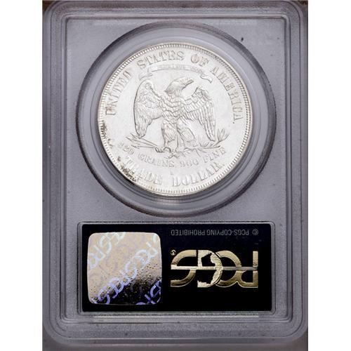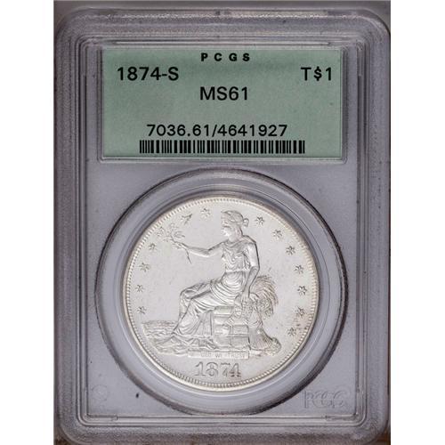 <B>1874-S<T$1> MS61 PCGS.</B></I> Medium S mintmark. A nicely struck and rather prooflike Trade dollar that has the scattered minor marks expected for the grade. Brilliant except for a few traces of verdigris along the lower left reverse margin. Certified in a green label holder. <BR><BR><B>Important notice:</B> Heritage usually auctions material at the rate of 200-250 lots per hour. On some occasions eBay Live bid software or the Internet may not be able to keep up with the pace of the auction. We recommend placing a realistic absentee bid now as insurance to avoid disappointment. Occasionally the auctioneer may eliminate or reject an eBay Live bid, and the auctioneer may also reopen a lot after the close of the eBay live bidding (usually because we missed an audience bid), and may reject your bid even if it shows you as the winning bidder. By bidding via eBay Live, you agree that Heritage may award the lot to another bidder at its sole discretion under the circumstances described above or any other reasonable circumstances. Since eBay bids are not shown to us until we open the lot on the floor, we treat those bids just like floor bids. In most cases the floor responds before the eBay bid is presented to us, due to Internet lag time, so for consistency we have made it a policy that floor bids are always considered first over tie eBay live bids. Also please note that all Heritage lots purchased through eBay Live carry a 20% Buyer's Premium. Please make sure you read the Terms and Conditions before you bid. This lot is being auctioned in conjunction with a live floor auction by Heritage Galleries & Auctioneers. All final auction and invoice information will be supplied by Heritage Galleries & Auctioneers, and all other information should be considered preliminary. Lot:2219 <BR><BR><B>Winning Notification and Billing:</B> After the FINAL session in this auction is complete, Heritage will send e-mail and snail mail invoices. This process normally takes several days. All final auction and invoice information will be supplied by Heritage Galleries & Auctioneers, and all other information should be considered preliminary. <BR><BR>This auction will be conducted on a live auction floor and over the Internet through eBay Live. If you choose to place an absentee bid, please take a moment to <font color='#0000ff'><u><a href='http://pages.ebay.com/liveauctions/help/before/laabsentee.html'>learn how eBay Live absentee bidding works</a></u></font><font color='#000000'>