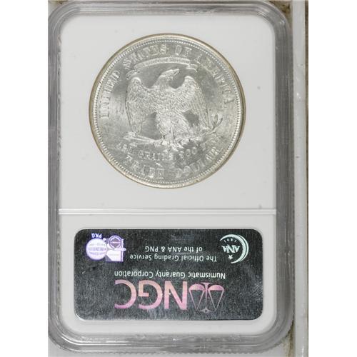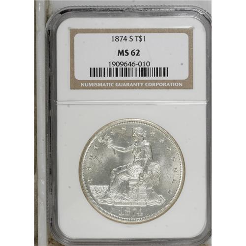 <B>1874-S T$1 MS62 NGC.</B></I> Medium S. This brilliant silver type coin has pleasing luster and a good strike. The strike is sharp aside from Liberty's hair, and only a few nearly imperceptible hairlines limit the grade.<BR><BR><b>Shipping:</b> Coins & Currency (<a target="_blank" href="http://www.heritageauctions.com/common/shipping.php">view shipping information</a>)