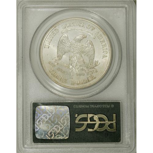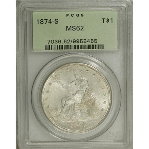 <B>1874-S T$1 MS62 PCGS.</B></I> Solidly struck with strong luster and a hint of golden toning against a shining silver-white background. Numerous light to moderate abrasions account for the grade.<BR><BR><b>Shipping:</b> Coins & Currency (<a target="_blank" href="http://www.heritageauctions.com/common/shipping.php">view shipping information</a>)