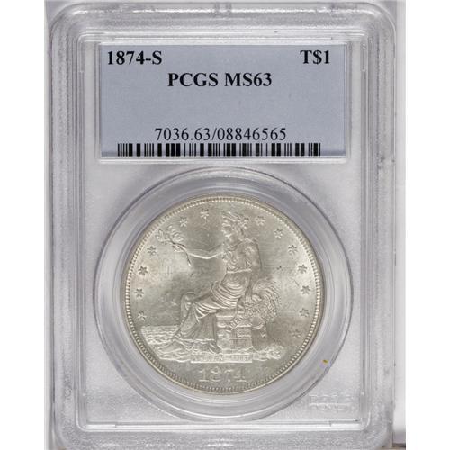 1874-S T$1 MS63 PCGS. Generally boldly struck, except